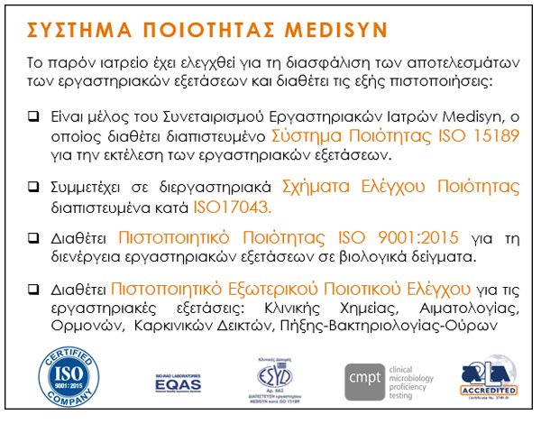 Το Ιατρείο εχει ενταχθεί στο δίκτυο MEDISYN, το πρώτο Πανελληνιο Συνεταιρισμό Ιατρών Βιοπαθολογων Πιστοποιημένης Ποιότητας και λειτουργεί με γνώμονα το επιστημονικό κύρος και την ποιοτική εξυπηρέτηση.